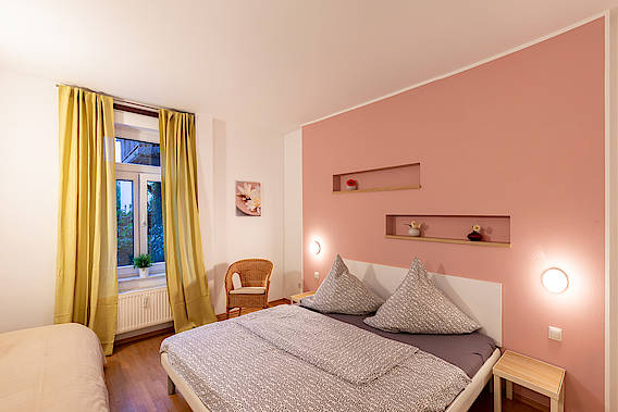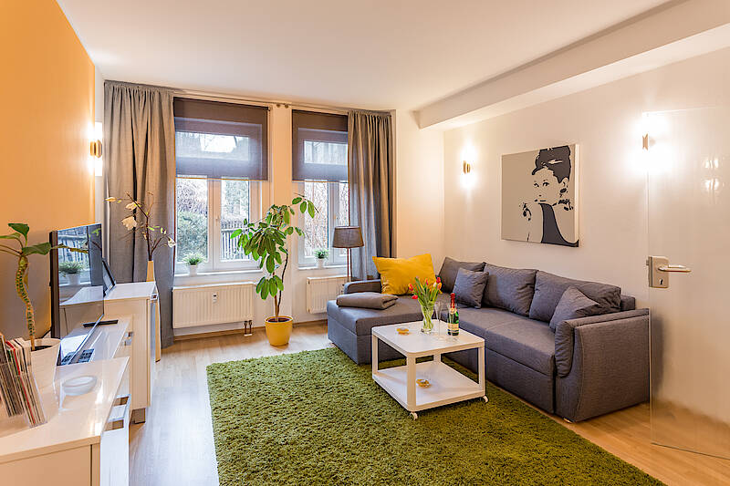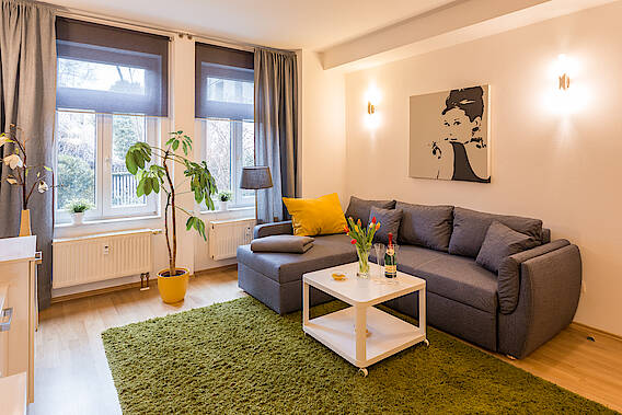 Im Wohnzimmer ist eine Wohlfühloase mit 2 modernen Ledersofas entstanden. An einem Esstisch mit 4 Stühlen können Sie gemütlich Ihre Mahlzeiten einnehmen. Im Schlafzimmer gibt es ein schönes Doppelbett (1,80 x 2,00 m) und ein Einzelbett, wo Sie sich herrlich Ihren Träumen hingeben können. Es gibt einen kleinen extra Raum am Schlafzimmer, wo Sie die Kleiderschränke finden.Im Außenbereich gibt es zwei kleine Sitzecken, welche ideal zum Verweilen einladen, falls Sie mal keine Lust haben, sich in Dresdens Nachtleben zu stürzen. Sie wohnen im Erdgeschoss. Parken können Sie im Hof oder in der Tiefgarage. Die Stellplätze sind gebührenpflichtig und extra über uns buchbar.