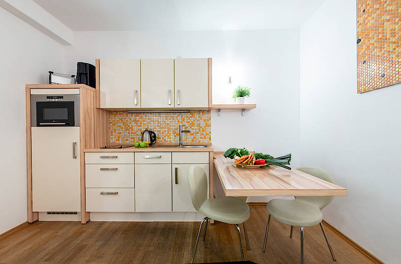 Die moderne Ferienwohnung liegt in einem Neubau in einem Hinterhaus. Sie haben ein Bad mit Dusche, WC, Waschbecken, Flur. Weiterhin gibt es eine offene Küche mit komplett eingerichteter Küchenzeile mit Kühlschrank, Spülmaschine, ausreichend Geschirr, Gläser, Besteck, Töpfe uvm.