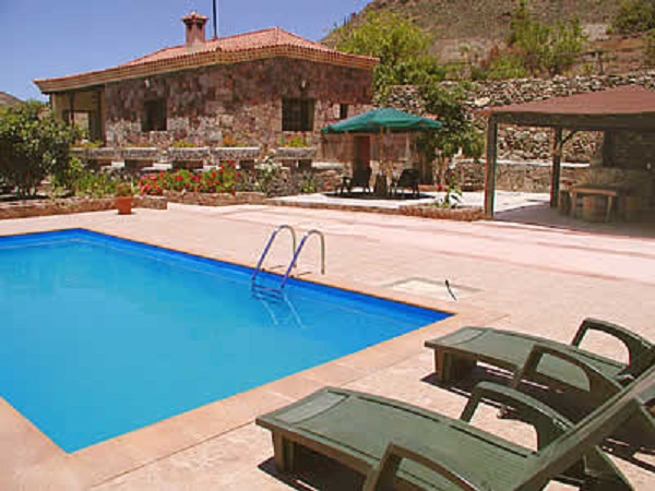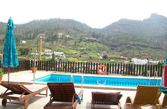 Casa rural de dos dormitorios con piscina climatizada de agua salada y expléndidas vistas a todo el valle. En ella se puede disfrutar de la tranquilidad y preciosas vistas bajo la sombra de un pequeño colgadizo canario o desde la piscina.