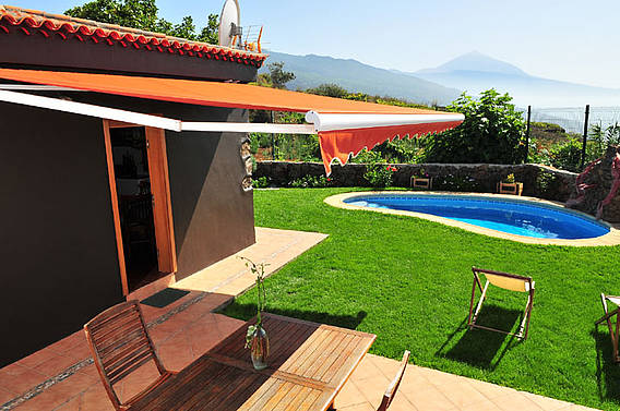 * En sus zonas exteriores los huéspedes pueden disfrutar del amplio jardín con piscina privada, barbacoa y magníficas vistas al mar y el Teide.