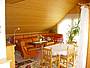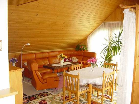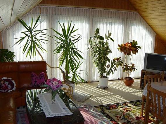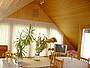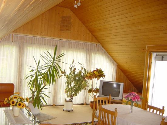 Das große und helle Wohnzimmer ist zum Giebel hin offen. Von den vier Giebelfenstern blickt man in Richtung Süden (Schweiz - etwa 800 m).