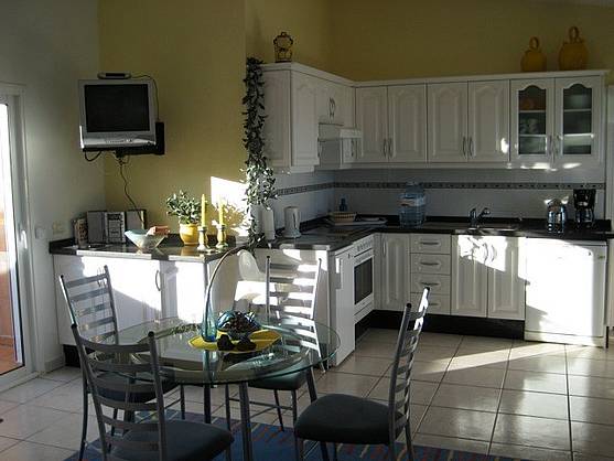 Zur Belebung der Sinne, sorgt aber auch eine Ausstattung, durch die die Finca zu den Spitzenobjekten Teneriffas gehört: Die offene Wohnküche, in die viel Licht einfällt und die voll ausgestattet ist mit einem Cerankochfeld, einem Backofen, einer Kühl- und Gefrierkombination, einer Mikrowelle sowie einem Geschirrspüler, damit unsere Feriengäste ihren Urlaub rundherum genießen können.