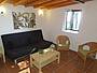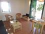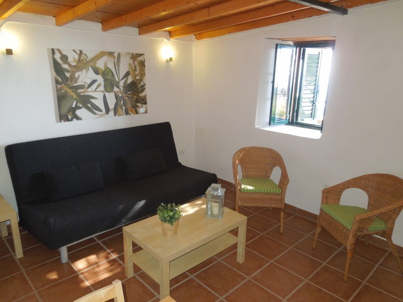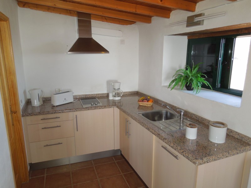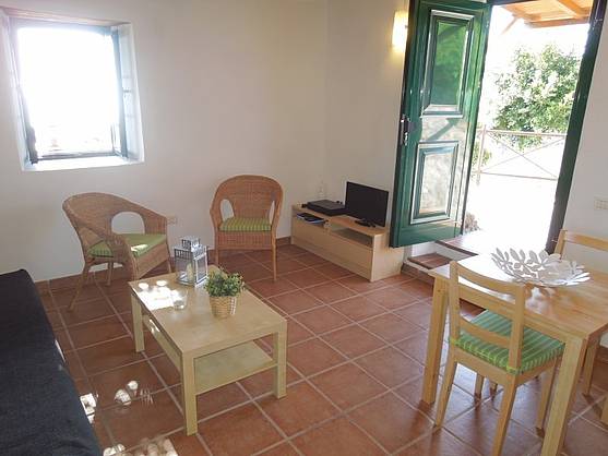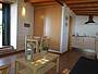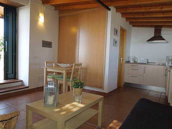 Das kleine Haus hat alle Räume in einem Zimmer: die Küche mit einer Arbeitsplatte aus Granit und allen Elektrogeräten, das Wohnzimmer mit Flachbild-Fernseher (und Satelliten-Fernsehen) und das gemütliche Sofa, das sich mit wenigen Handgriffen zum Schlaf-Sofa (1,50 x 2,00 m) umbauen läßt. Außerdem gibt es eine Esszimmerecke.