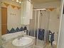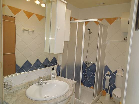 Im Badezimmer gibt es eine Dusche mit Duschabtrennung und einem Spiegelschrank mit Haarfön.