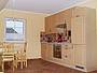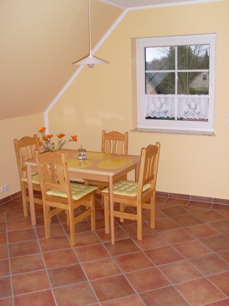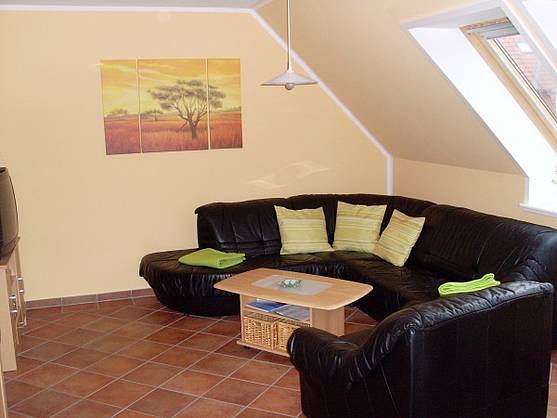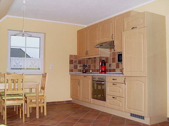 Die Ferienwohnung liegt im Obergeschoss und hat eine Größe von ca 55 m². Die Wohnung hat keinen Balkon. Es existiert eine Sitzgelegenheit auf dem Grundstück. Die Wohnung besteht aus einer Wohnküche, Bad und einem Schlafzimmer. Die Wohnküche ist ca 25m² groß und hat einen separaten Essbereich. Im Schlafzimmer kann ein Kindereisebett aufgestellt werden. Küchenausstattung: Herd, Backofen, Kühlschrank mit Tiefkühlfach, Geschirrspülmaschine, Mikrowelle, Kaffeemaschine, Toaster, Wasserkocher.