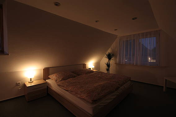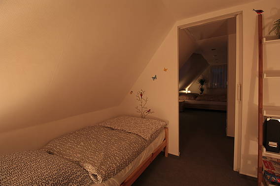 Im Dachgeschoss befinden sich zwei Schlafzimmer. Das Elternschlafzimmer ist mit einem Doppelbett, Kleiderschrank und TV mit DVD-Player ausgestattet. Zwei Einzelbetten stehen im kleinen Schlafzimmer.