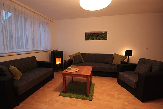 Das Erdgeschoss umfasst eine komplett ausgestattete Küche, Bad mit Dusche, Waschmaschine und zusätzlicher Heizung, ein Wohnzimmer mit Couch, Essecke, TV, Radio/CD und einem Pelletofen mit dem Sie individuell das Haus beheizen können.