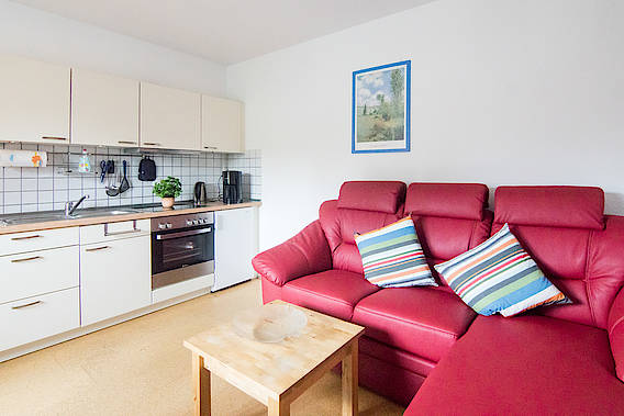 Zur Fewo. im EG. gelegen gehören ein Eingangsflur, ein Duschbad mit WC., ein Schlafzimmer mit Doppelbett, eine helle, geräumige und gut ausgestattete Wohn-Küche mit zus. Schlafgelegenheit, ein Internetzugang über W-Lan, eine bestuhlte Terrasse mit Strandkorb und ein Parkplatz.