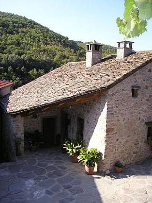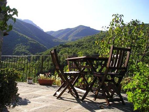 La Bedina is an old ancient house made with sandstone and with a stony roof covered with piagne, sandstone sheets, laid on a plank surface. In front of the house is the beatiful aia, a large space paved with it original flagstones, and a well. The upper level was the old living area of the house, the lower floor originally consisted of three cellars, two of which were once used as stables, the third being a wine cellar. The part of the house available to guests is the upper level which consists of four rooms: the kitchen, the bedroom, the large living room and the bathroom, a total area of around 60 square meters. The entrance to the house is via the kitchen which was once the old gradile, the local name for a chestnut drying room.he kitchen now is a small but lovely and well organized room. The cooking area consists of the cooking plate hosted in a chestnut BANCONE which has shelves for pots and food and where the electric oven finds its place. The washing sink is a two-vasche ceramic sink that was found in an old "bottegha" (old shop of an artigiano) of Florence of an old plumber with the passion of collection old materials. In the kitchen there is also the dining table, but you have the options of having your meals in the spacious living room or in the terrace where you can enjoy also the beautiful view, the songs of birds and the sound of the Magra River. The kitchen is well equipped. When we bought the house, the bedroom was full of cages for rabbits and other domestic animals and it was used as a chicken coop. Today this room has two walls of exposed stonework, a wall of canniccio, and a vaulted ceiling. Both the wall of canniccio and the vaulted ceiling are constructed in the traditional manner which consists of a frame of chestnut wood supporting woven sticks of hazel covered in plaster. The living room is a large environment divided into two areas: the living area with a dining table and its original corner cupboard, and the sleeping area with a sofa bed and large high backed bench. The centrally placed wood burning stove heats the room during the cold months, whilst the two windows and French doors which face south fill the room with light. This room has all four walls in exposed stonework and in one of the two niches you can still see the old clay urn in which money and precious objects would have been hidden. This niche would have been covered with a stone slab and plastered over so that it wasn’t visible, in other words this was the ancient version of the modern wall safe. The living room is a spacious and sunny room where you can enjoy you meals, or you can relax reading a book, listening to a nice cd, or watching a good movie. Available to guests are a collection of Italian and English books, cd, satellite TV and radio, the stereo and the DVD reader. The window doors in the living room lead out onto the terrazza, a large balcony paved with sandstone slabs, from which you have a wonderful view of the valley below and of the village of Casalina. In the terrace you can find a dining table and umbrellas and it is a perfect place to have you breakfast or your dinners with grilled meat or fished prepared with the barbecue available in the portico, which can be used also to cook bread, pizzas and cakes. Steps lead down from the terrazza to the arches below with their imposing stone pillars, to the old stables and cantina, and to the vineyard. The vineyard, which is presently being restored, is around 1000 square meters in size and produces a large quantity of good wine. On the land below the vineyard an organic vegetable garden is being created. From the living room you pass through into the bathroom which was once used as a storage area for food like flour or potatoes. We found a couple of large wooden chests here which had been used for that purpose. The bathroom is characterised by exposed stonework walls, a ceiling of chestnut beams and planks, a built in shower, and the original chestnut doors which we have restored. The large stone doorposts and lintel between the bathroom and the living room show that this was originally a main entrance to the house and that what is now the bathroom was once a large porch that at some point was enclosed with walls to create a room.
