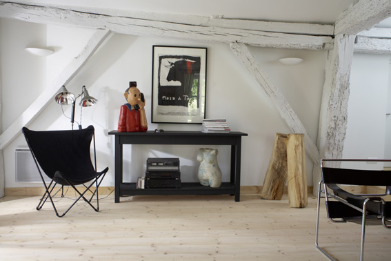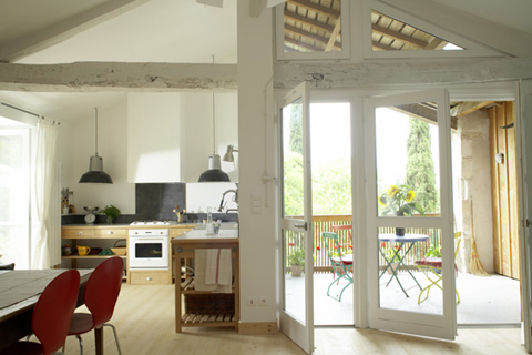 Küche, Eß- und Wohnzimmer bilden eine über 50 m2 große Einheit. Auf zwei Ebenen liegen 3 große Schlafzimmer mit Doppelbetten, zwei Bäder und ein separates WC. La Grange bietet 6 Personen bequem Platz. Die Wohnung besitzt eine geschützte, nach Süden gelegene Loggia und eine 60 m2 große Terrasse mit weitem Blick auf die romanische Kirche und die Burg-Silhouette von Lusignac.
