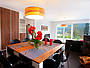 Integriert im Wohn- und Essbereich befinden sich in zwei Ebenen, der Ausblick ins Grüne ist hiermit auch aus dem rückwärtigen Teil des Gebäudes möglich und durch die großzügigen Eckfenster wird der Blick in die Natur ermöglicht. Große Holzterrassen erweitern den Wohnraum in den Außenbereich.