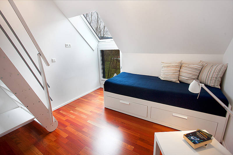 Die Innenraumgestaltung führt das Konzept konsequent fort. Dunkle Böden und Naturholz stehen im Kontrast zu den schlichten, weiß verputzten Decken und Wänden.