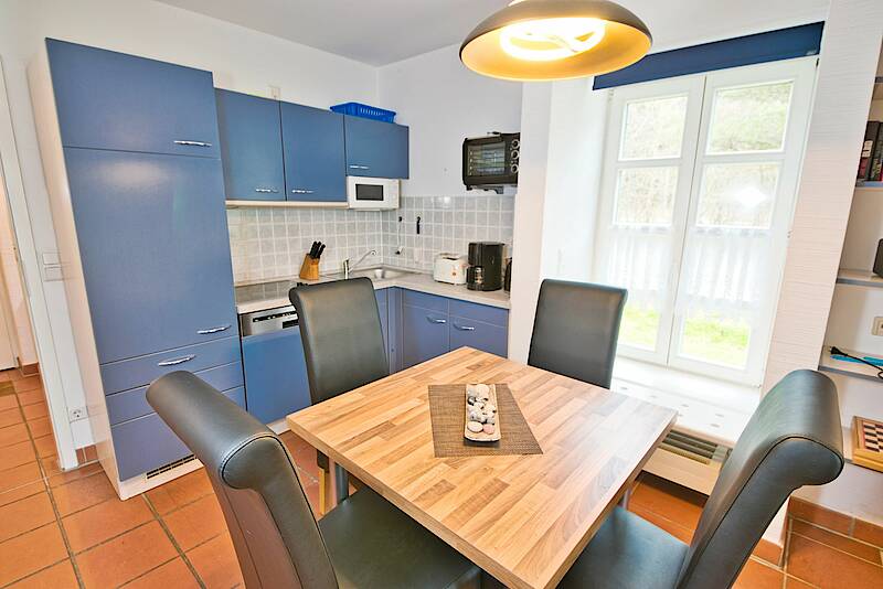 - komplett ausgestattete Einbauküche und Esstisch mit 4 Stühlen (Toaster, Kaffeemaschine, Wasserkocher, Mikrowelle, Geschirrspüler, Ceranfeld mit 4 Kochzonen, Grill- und Backautomat, Kühlschrank mit Gefrierfach, Geschirr und Töpfe)