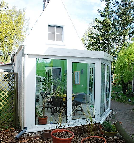 Arbeitsbereich im Spitzboden, Wintergarten = Eingangsbereich