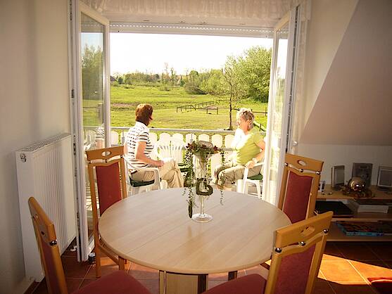 Vom Wohn- und Schlafzimmer haben Sie direkten Blick auf den Wieker Bodden.