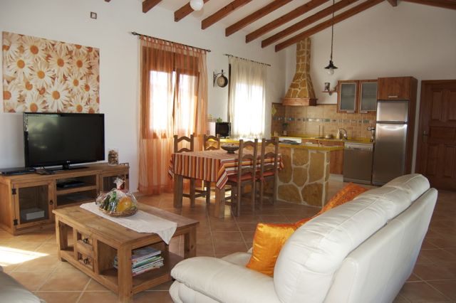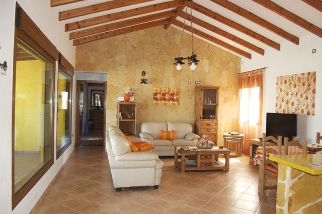 * Living room with Satellite-TV and DVD, and view over the pool;
